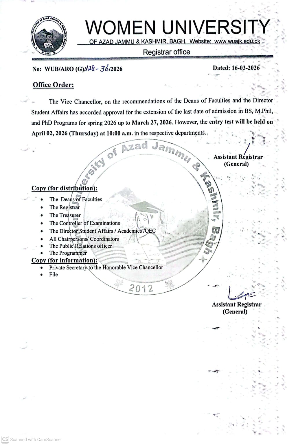 The last date for admissions to BS, MPhil, and PhD programs for Spring 2026 has been extended to March 27, 2026. 2026/03/17